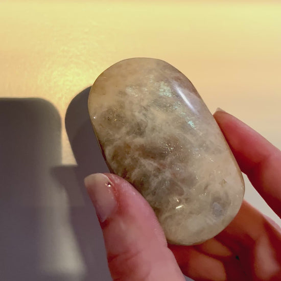 Unlock the mystical properties of Moonstone in this exquisite palm stone. Revered for its connection to the moon and intuitive insight, this palm stone radiates with an enchanting rainbow sheen.